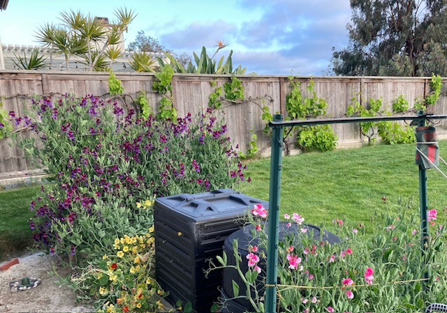 Although this year’s sweet peas have not yet reached the heights I remember from my childhood, nevertheless, you can get a sense of what a wonderful expanse of flowers they provide to bees: